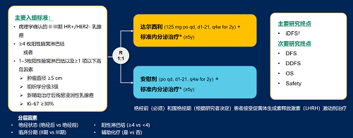 达尔西利(Dalpiciclib)是AG亚游医药自主研发的口服、选择性的小分子CDK4/6抑制剂,也是中国首个自主研发的新型高选择性 CDK4/6 抑制剂,已证实其与内分泌治疗(ET)联合用于 HR+/HER2- 晚期乳腺癌的一线和后线治疗时,均显著改善无进展生存期(PFS)6,7。因此开展了一项随机、双盲、III期临床试验(DAWNA-A),以进一步评估达尔西利联合内分泌治疗作为高危早期 HR+/HER2 - 乳腺癌辅助治疗的效果。本研究纳入高危复发风险人群需满足以下标准之一:①≥4 枚阳性腋窝淋巴结;②1–3枚阳性腋窝淋巴结且合并≥1 项高危因素(肿瘤直径 ≥5 cm,组织学分级3级,辅助治疗后残留浸润性乳腺癌,Ki-67 ≥30%)。本文呈现预先设定的首次中期分析(IA1)结果。